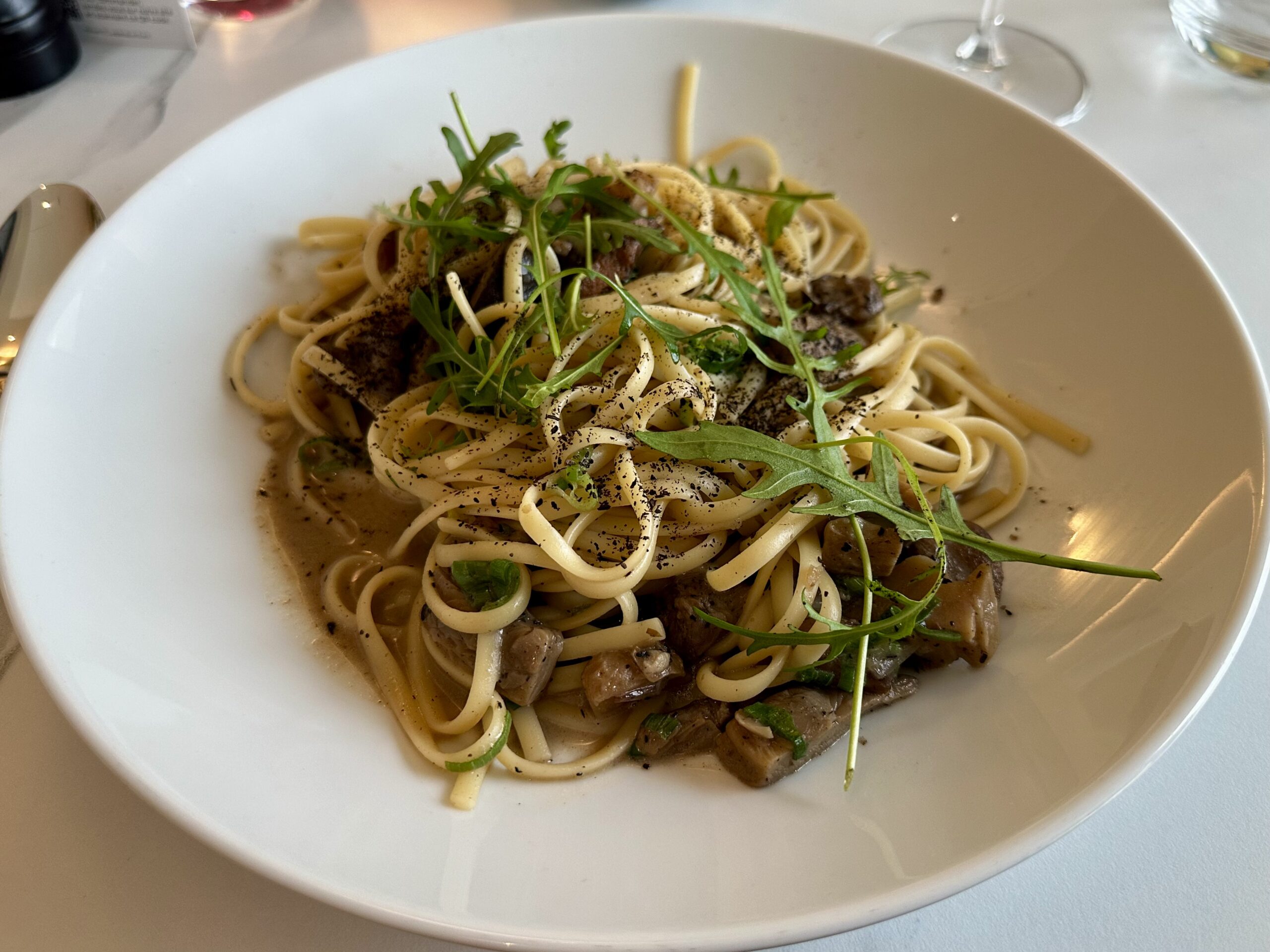 La terrine de gibier au cranberries en entrée : généreuse, avec une belle texture et des saveurs franches. On sent le travail artisanal. Les linguines aux champignons de saison qui suivaient jouaient la carte de la simplicité assumée, avec des champignons bien présents et une cuisson al dente parfaite.