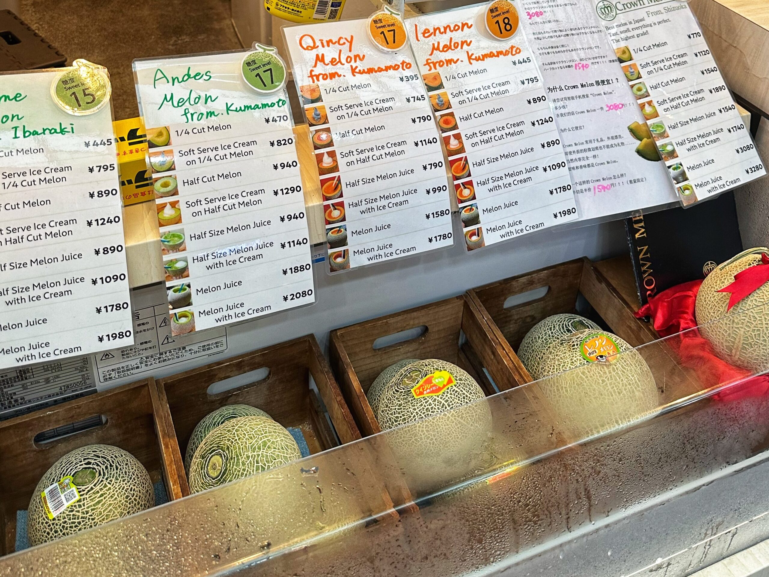Prix : Demi-melon glacé à partir de 1 200 yens (8€), quart de melon 600 yens (4€)