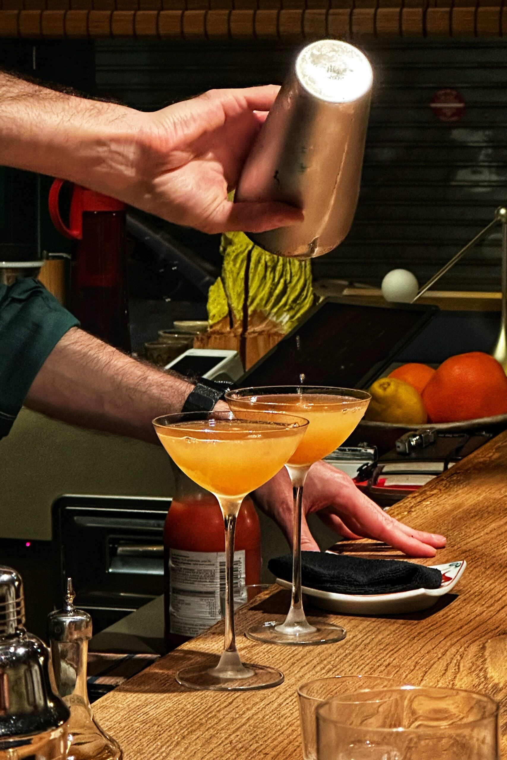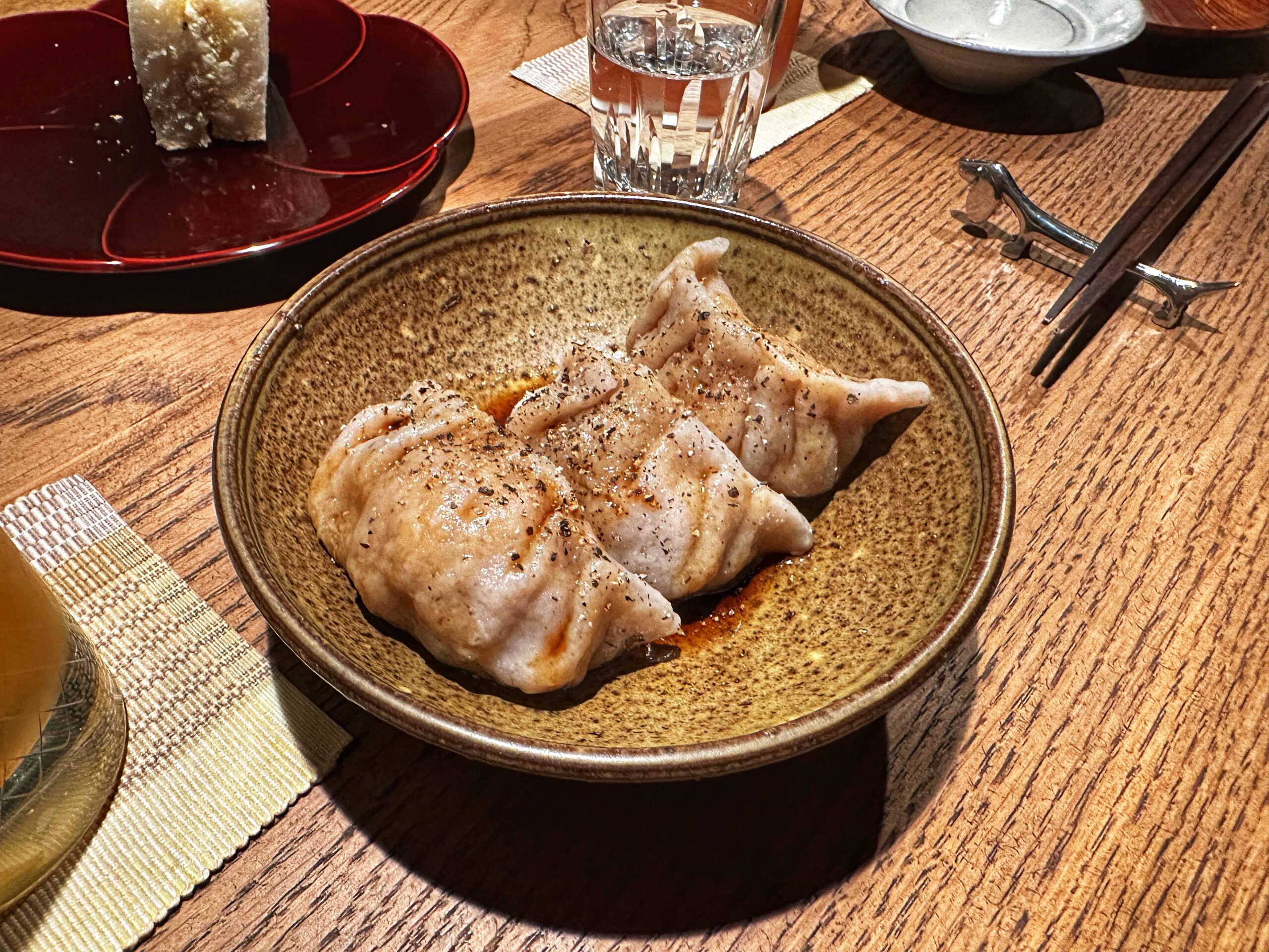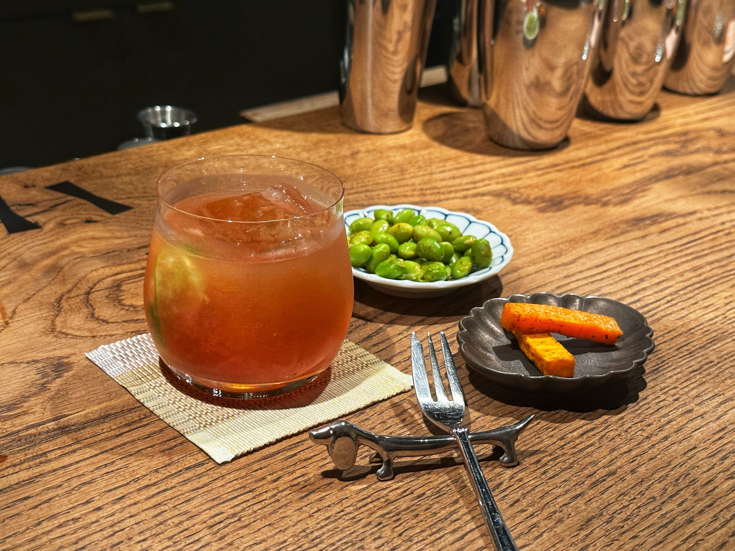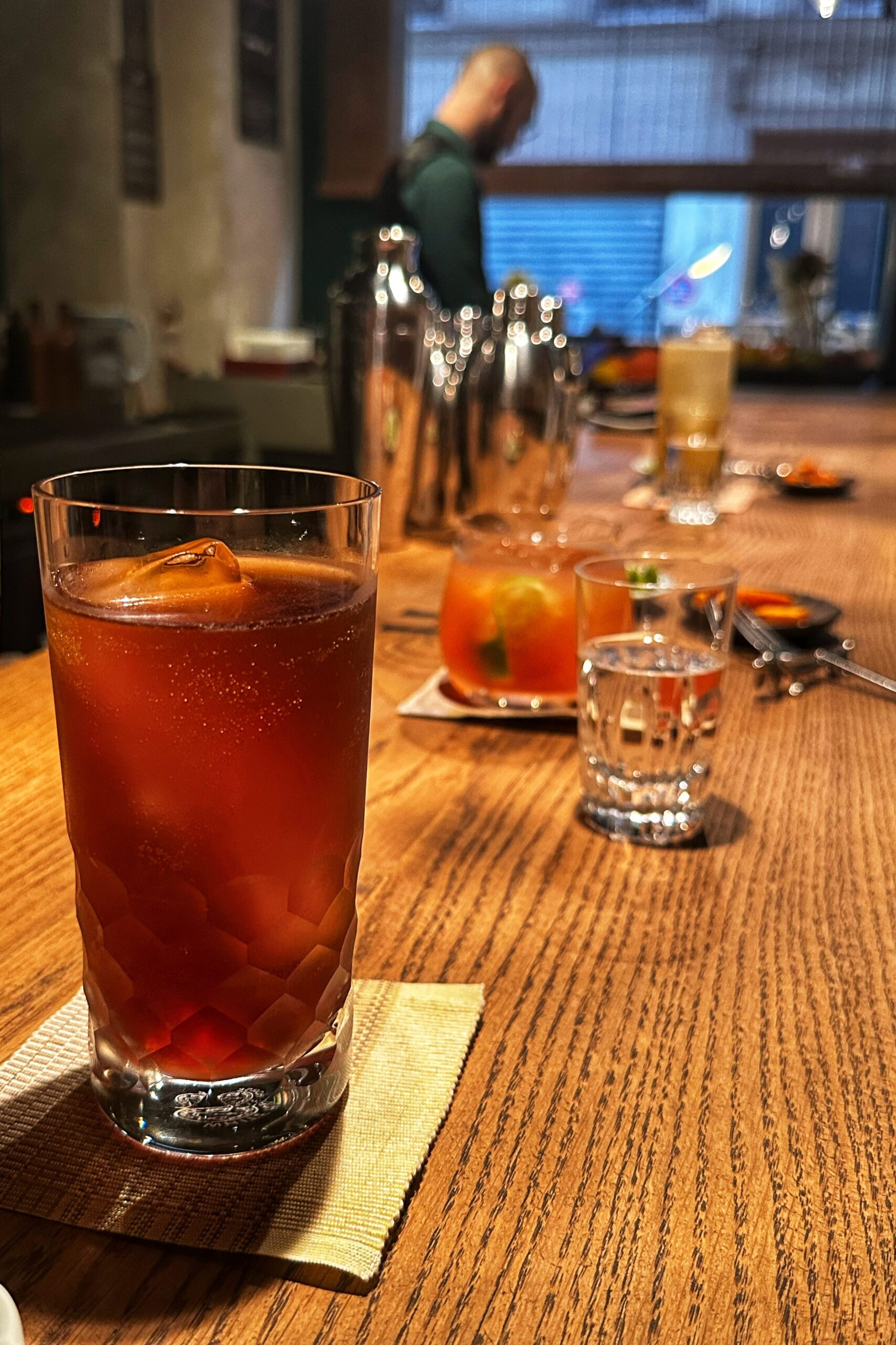 Quand j’ai poussé la porte avec des amis vers 19h30, nous avons eu la chance de nous installer directement au comptoir face au barman. Cette proximité avec Frédéric Paolini, nippophile confirmé qui a œuvré chez Ogata, nous a permis d’observer de près son travail minutieux aux côtés d’Anaïs, sa compagne franco-japonaise.
