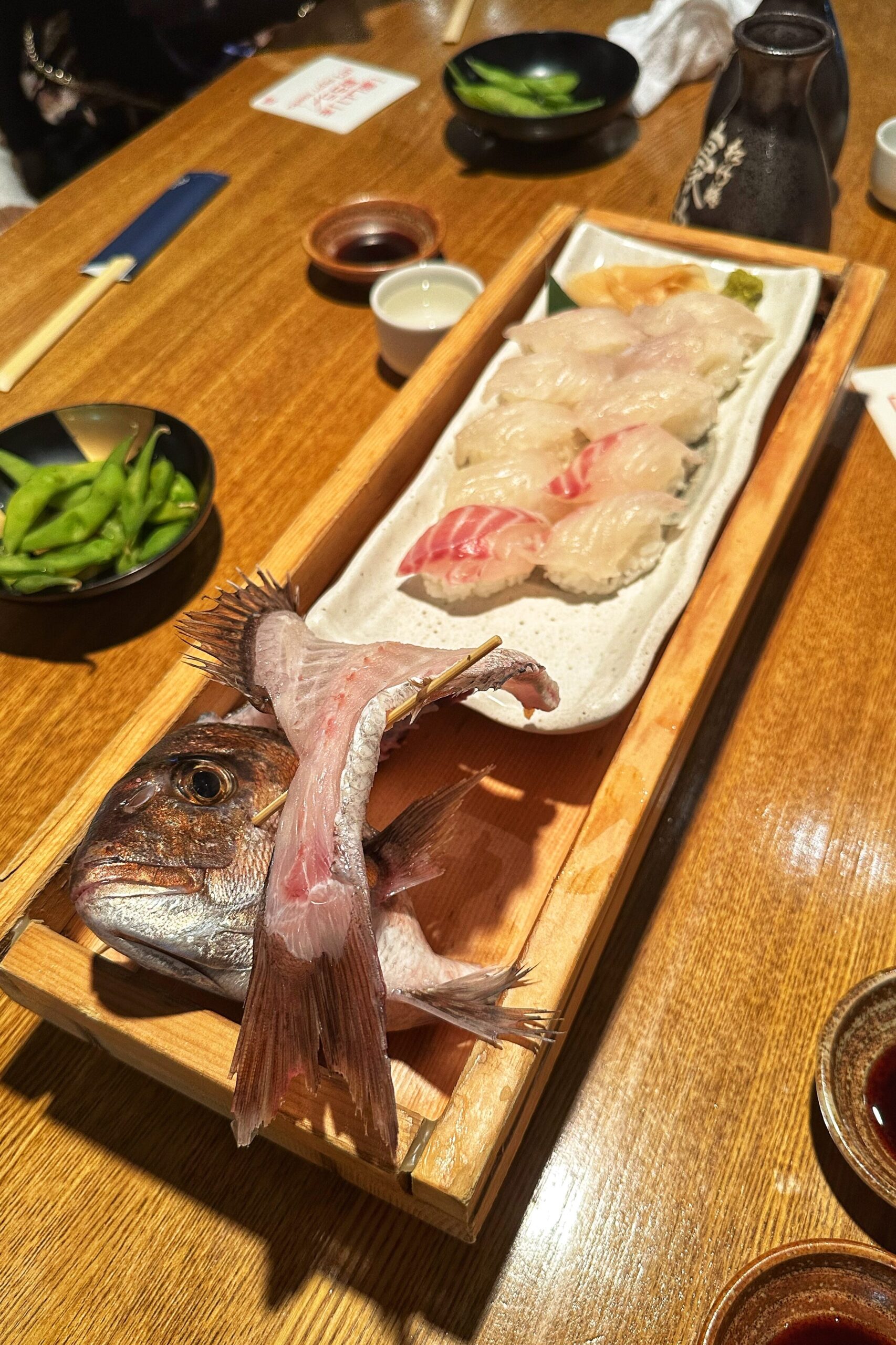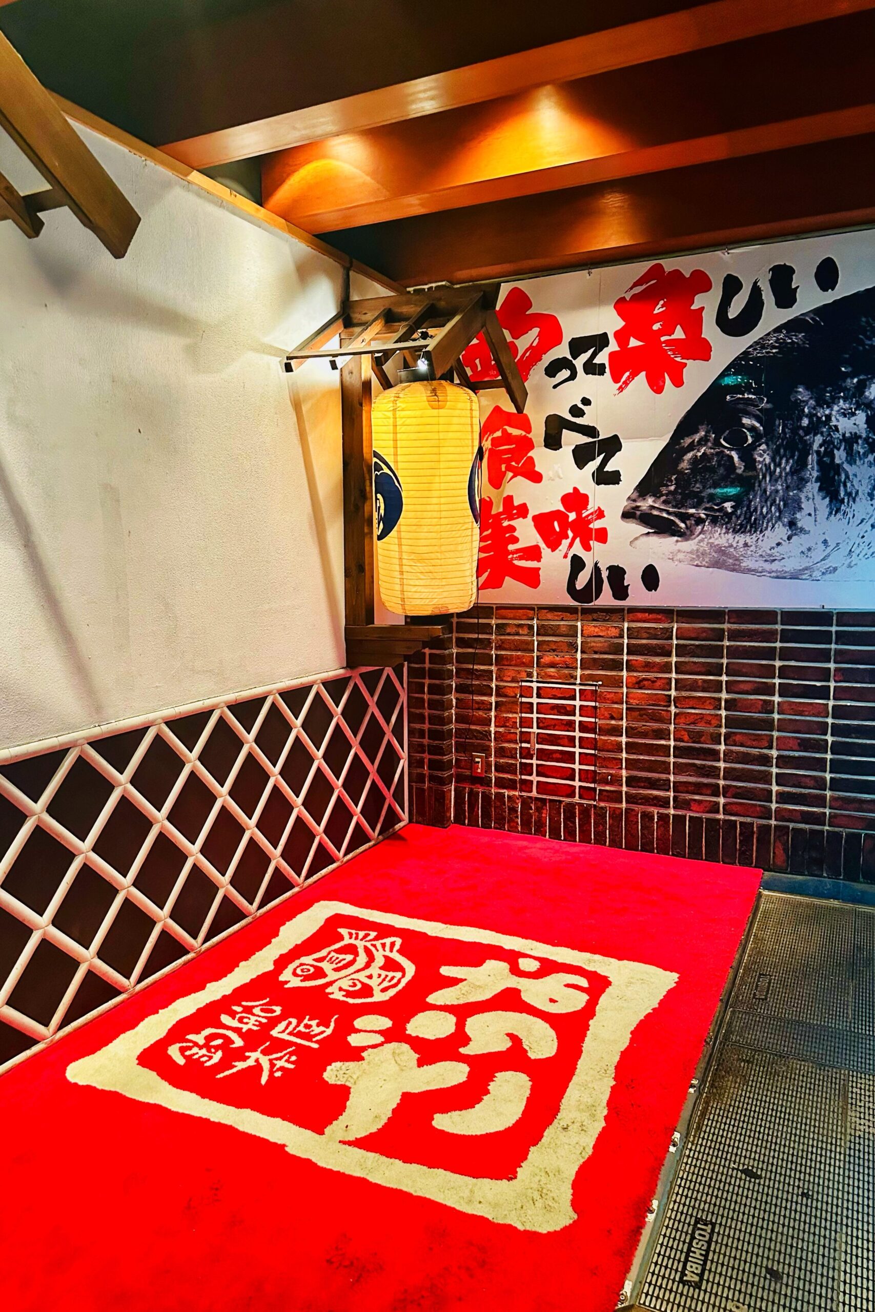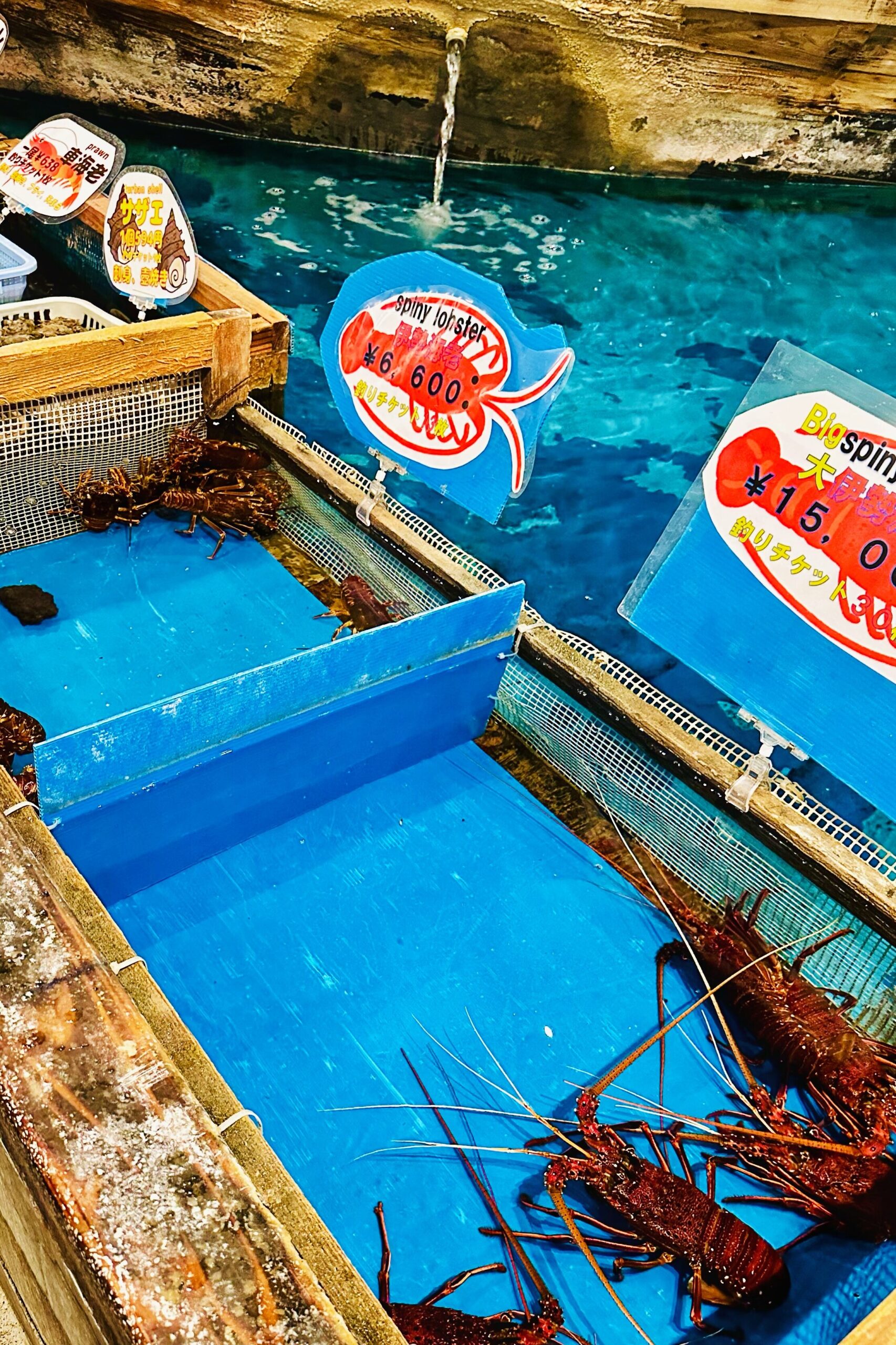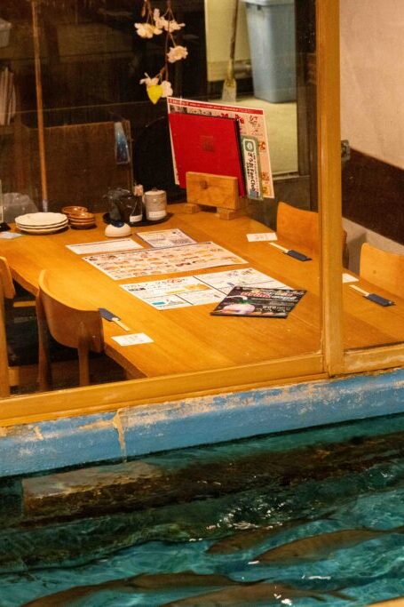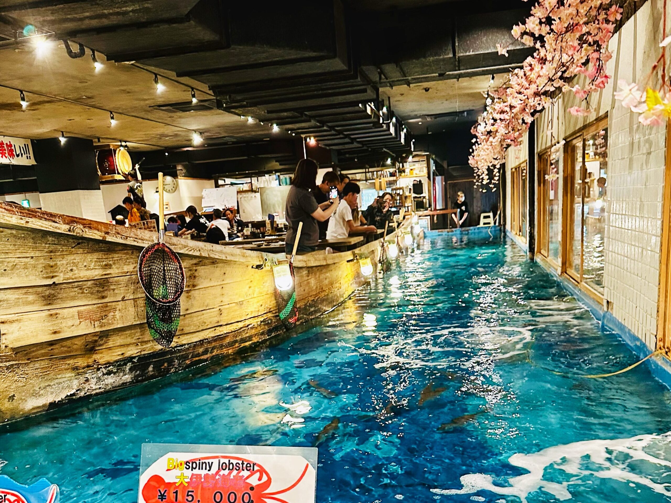 Dès l’entrée, on comprend qu’on n’est pas dans un restaurant classique. Un énorme aquarium trône au centre de la salle, et on peut pêcher depuis des sièges installés sur un bateau. L’ambiance rappelle à la fois un port de pêche et un izakaya traditionnel, avec cette énergie communicative qui rend l’endroit si attachant.